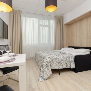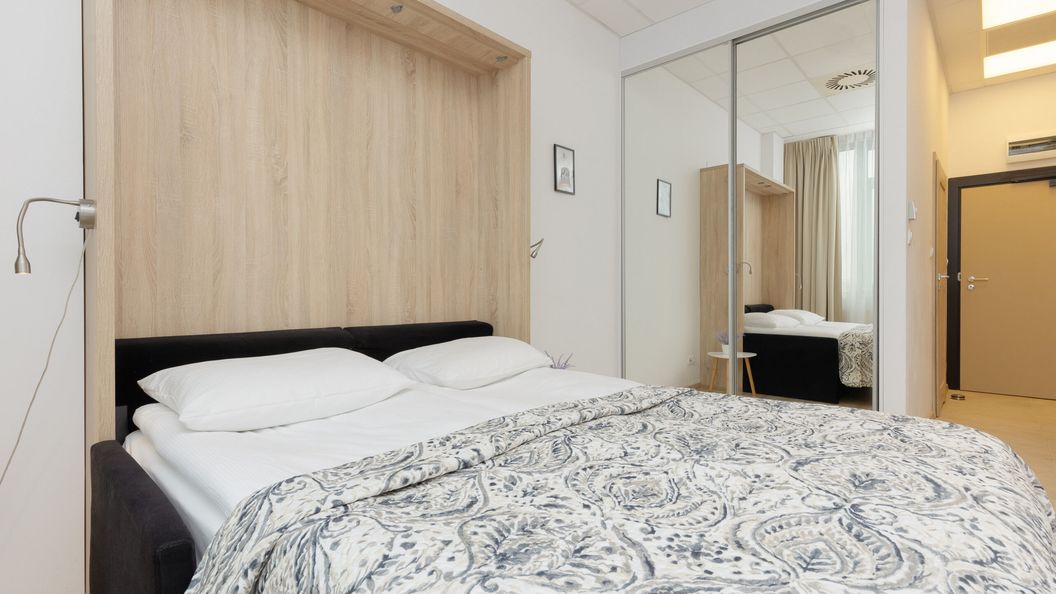 Podwójne łóżko z możliwością składania jako kanapa, stolik nocny, TV, stół z 2 krzesłami, szafa z lustrem
