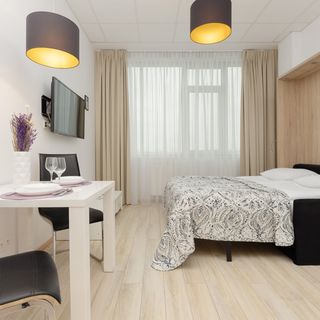 Ten komfortowo wyposażony apartament typu studio może pomieścić 2 gości. Składa się z salonu z aneksem kuchennym oraz łazienki z wanną. Dużym atutem jest klimatyzacja dbająca o odpowiednią temperaturę wnętrza. Funkcjonalne wyposażenie apartamentu takie jak zmywarka czy mikrofalówka pozwalają czuć się jak w domu, a o rozrywkę dbają multimedia takie jak bezpłatne bezprzewodowe łącze internetowe oraz telewizor z płaskim ekranem, telewizją kablową i dostępem do SmartTV. Wnętrze jest ciepło i gustownie urządzone. Na dobry początek pobytu zapewniamy gościom bezpłatny zestaw kosmetyków, ręczniki oraz pościel.