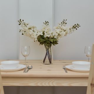 Stół z 2 krzesłami, płyta indukcyjna, piekarnik, lodówka z zamrażarką, zmywarka, mikrofalówka, szklanki, kubki, zestaw naczyń i sztućców, patelnia
