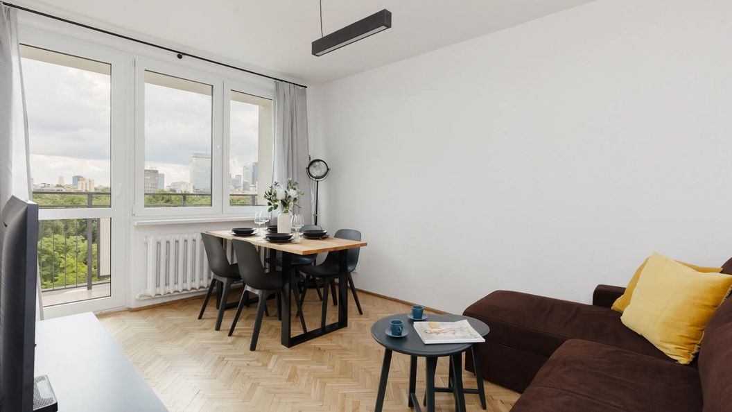 Komfortowy warszawski apartament gwarantuje wygodne zakwaterowanie dla 4 osób. To doskonały wybór na wyjazd z rodziną lub przyjaciółmi. Powierzchnia została podzielona na salon z aneksem kuchenny, sypialnię oraz łazienkę z wanną. Wnętrze jest funkcjonalnie zaprojektowane i gustownie wykończone, wychodząc naprzeciw wszelkim potrzebom gości. Umiejętnie dobrana kolorystyka dominująca w apartamencie sprawia, że całość prezentuje się bardzo przytulnie, a jednocześnie stylowo. Salon wyposażony w komfortową sofę oraz telewizor Smart TV z dostępem do kanałów telewizji kablowej, stanowi doskonałe miejsce odpoczynku i relaksu. W części dziennej znajduje się także stół z krzesłami, idealny do celebrowania wspólnych posiłków. Sypialnia oferuje bardzo wygodne łóżko małżeńskie oraz pojemną szafę. Do apartamentu przynależy także balkon z meblami ogrodowymi z widokiem na panoramę stolicy – świetny do odpoczynku po dniu pełnym wrażeń. Dzięki wyposażeniu we wszystkie niezbędne sprzęty kuchenne (zmywarka, piekarnik) oraz łazienkowe (pralka, suszarka do włosów), goście mogą poczuć się tu niezwykle swobodnie i komfortowo. Udogodnienia obejmują również wyposażenie multimedialne - telewizor typu Smart TV i kanały kablowe oraz bezpłatne łącze internetowe Wi-Fi. Aby ułatwić rozpoczęcie każdego pobytu, na Gości czeka bezpłatny zestaw kosmetyków, ręczniki i pościel. Rodzice podróżujący z dzieckiem mają także możliwość rezerwacji łóżeczka dla swojej pociechy. Lokalizacja apartamentu z pewnością pozwoli poczuć klimat stolicy wśród okolicznych atrakcji.