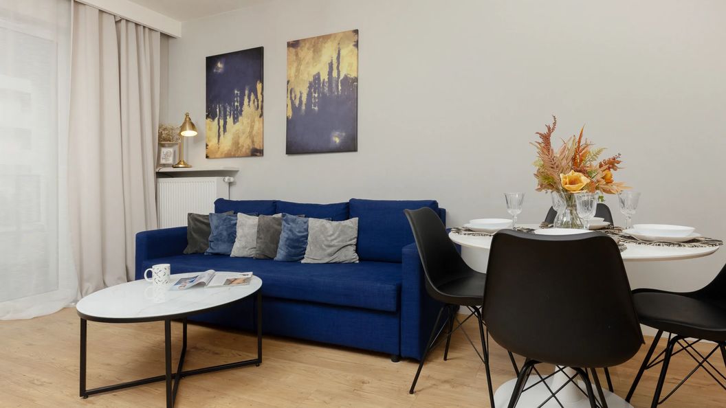 Ten kompleksowy apartament z balkonem ma możliwość zakwaterowania 4 osób - jest to idealny wybór na rodzinny wyjazd lub dla pary przyjaciół. Wysoce funkcjonalna przestrzeń o powierzchni 42 m² składa się z salonu z aneksem kuchennym, sypialni oraz łazienki z prysznicem i toaletą. Część dzienna wyposażona w wygodną sofę, jak i sypialnia z podwójnym łóżkiem, stanowią doskonałe miejsce odpoczynku oraz relaksu. Dodatkowo, do apartamentu przynależy balkon, gdzie można cieszyć się poranną kawką, czy odpocząć po dniu pełnym wrażeń. Kompleksowe wyposażenie w niezbędny sprzęt kuchenny, łazienkowy oraz bezpłatne łącze Wifi i telewizor z płaskim ekranem zapewniają komfortowy pobyt. Sypialnia posiadają także toaletkę, która może posłużyć jako biurko, dzięki czemu goście pracujący zdalnie będą mogli w komfortowy sposób zadbać o obowiązki służbowe. Dla ułatwienia rozpoczęcia każdej wizyty zapewniony jest bezpłatny zestaw kosmetyków (mydło, szampon i żel pod prysznic), ręczniki oraz pościel. Obiekt wyróżnia się starannym wykończeniem, a wysokiej jakości wyposażenie eksponuje wysoki standard mieszkania. Dopełnieniem wyjątkowej aury mieszkania jest atrakcyjna kolorystyka wnętrza z zastosowaniem stylowych elementów dekoracyjnych. Jasna i nowoczesna przestrzeń nadaje apartamentowi lekkości i eleganckiego charakteru.