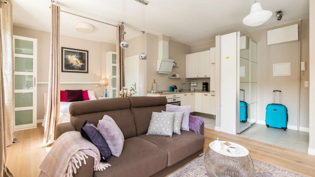 Wnętrze przeznaczone jest dla maksymalnie 4 osób i składa się z jednego, wielofunkcyjnego pomieszczenia. Do dyspozycji gości jest łóżko małżeńskie oraz rozkładana sofa, co zapewnia elastyczność w aranżacji przestrzeni. W apartamencie wydzielono również miejsce do pracy z biurkiem, co stanowi udogodnienie dla osób podróżujących służbowo lub uczących się.