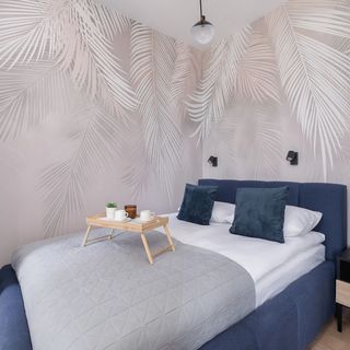 Podwójne łóżko, pościel, szafka nocna, szafa, biurko z krzesłem