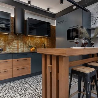 Lodówka z zamrażarką, zmywarka, czajnik, mikrofalówka, zestaw naczyń kuchennych i stołowych, wyspa ze stołkami do siedzenia