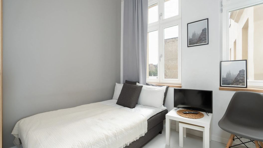 Mieszkanie jest przeznaczone dla 2 osób i składa się z jednego pomieszczenia pełniącego funkcję salonu z aneksem kuchennym oraz osobnej łazienki. Centralnym punktem części dziennej jest rozkładana, dwuosobowa sofa, a do dyspozycji gości jest również szafa i stolik z telewizorem. Aneks kuchenny wyposażono w płytę indukcyjną, lodówkę, kuchenkę mikrofalową oraz niezbędne naczynia i akcesoria do gotowania.