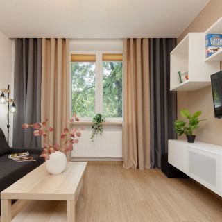 Mieszkanie znajduje się na parterze i obejmuje salon z rozkładaną sofą i telewizorem, połączony z aneksem kuchennym, oraz oddzielną sypialnię z podwójnym łóżkiem i drugim telewizorem. Aneks kuchenny jest w pełni wyposażony i zawiera płytę indukcyjną, piekarnik, lodówkę z zamrażarką, zmywarkę oraz kuchenkę mikrofalową. Do dyspozycji gości jest również komplet naczyń, garnków i sztućców.