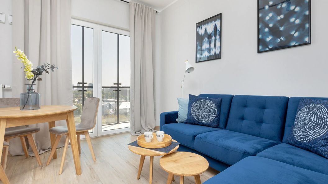 Nowoczesny apartament zlokalizowany w kompleksie mieszkalnym na warszawskiej Woli, z którego rozpościera się widok na panoramę miasta.