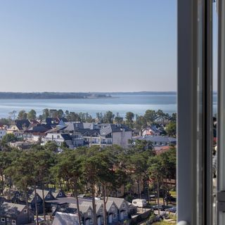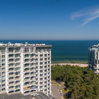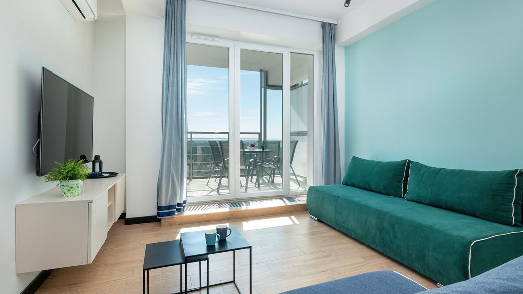 Zaaranżowany w wysokim standardzie nadmorski apartament typu studio to miejsce, w którym pobyt jest prawdziwą przyjemnością. Ten wyjątkowy apartament może być wygodnym noclegiem dla 4 osób – idealny na pobyt z rodziną czy przyjaciółmi. Układ pomieszczeń składa się ze studia z aneksem kuchennym, balkonu oraz łazienki z prysznicem. Przestrzeń jest bardzo funkcjonalna, co pozwala na elastyczną i wygodną konfigurację układu spania: goście mogą wybrać pomiędzy dwiema rozkładanymi sofami. Studio wyposażono także w stół z krzesłami do wspólnego celebrowania posiłków. Wysublimowana aranżacja apartamentu oraz wysokiej jakości wyposażenie gwarantują pobyt na najwyższym poziomie. Dla jeszcze większej wygody naszych gości – studio jest w pełni klimatyzowane. Dopełnieniem wyjątkowej aury mieszkania jest atrakcyjna kolorystyka wnętrza nawiązująca do nadmorskiego położenia obiektu z zastosowaniem stylowych elementów dekoracyjnych. Apartament przesiąknięty jest atmosferą Wybrzeża: jego panoramiczne okna wychodzą na zachwycająco zieloną okolicę z widokiem na zalew. Salon ma wyjście na prywatny balkon wyposażony w meble ogrodowe - idealne miejsce do rozkoszowania się promieniami słońca, jednocześnie zapewniające poczucie ciszy i spokoju. Multimedialne udogodnienia obejmują bezpłatny dostęp do sieci Wi-Fi oraz Telewizor typu Smart TV z płaskim ekranem – świetnie sprawdzi się na seanse filmowe. Pełne wyposażenie łazienkowe i kuchenne - takie jak pralka, mikrofalówka, piekarnik, toster, zmywarka czy ekspres do kawy- zwiększa niezależność naszych gości. Na dobry początek każdego pobytu zapewniony jest bezpłatny zestaw kosmetyków, ręczniki i pościel. Lokalizacja apartamentu z pewnością pozwoli poczuć nadmorski klimat wśród najważniejszych atrakcji. Dzięki tym zaletom apartament jest idealnym wyborem na beztroski pobyt nad Wybrzeżem.