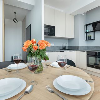 Mikrofalówka, ekspres do kawy (przelewowy), toster, płyta indukcyjna, opiekacz, zmywarka, piekarnik, zestaw sztućców i naczyń, lodówka z zamrażarką, przybory kuchenne, czajnik elektryczny, szklanki, kubki, garnki, patelnia, kieliszki do wina