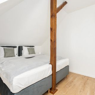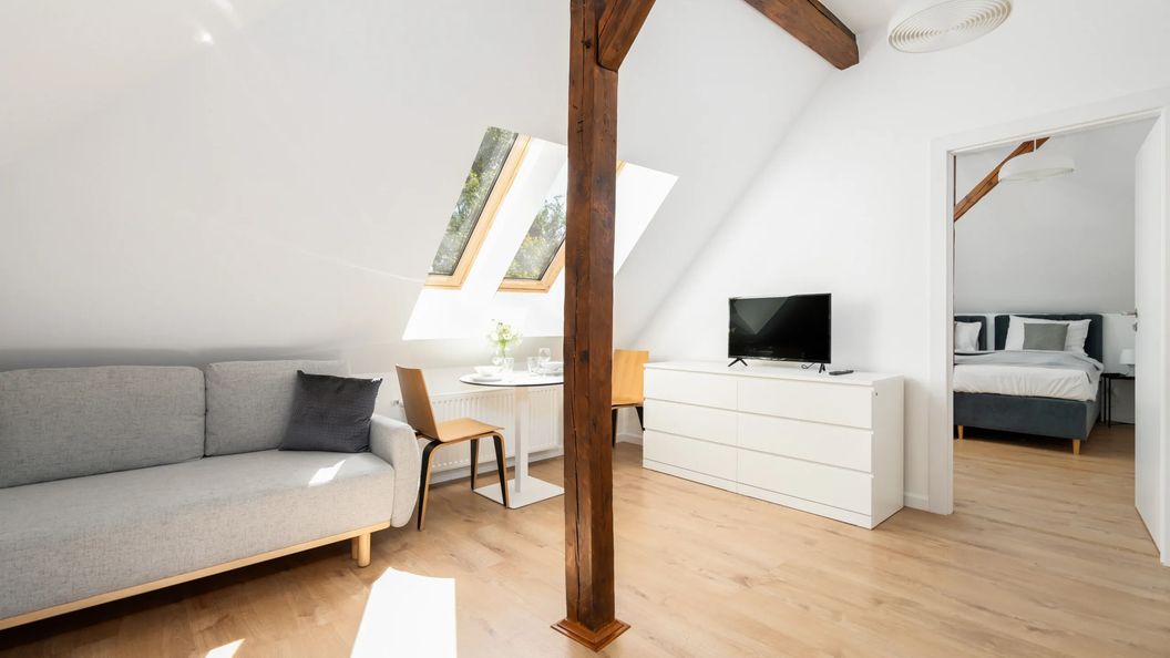 Ten jasny, komfortowy apartament może zakwaterować 4 osoby. Składa się z salonu z aneksem kuchennym, sypialni oraz łazienki z prysznicem. Wnętrze zachęca przytulną, atmosferą dzięki neutralnej kolorystyce z elementami drewna. Część dzienna wyposażona w wygodną, rozkładaną sofę oraz telewizor Smart TV z płaskim ekranem stanowi doskonałe miejsce odpoczynku i relaksu. Duże okna dachowe wypełniają przestrzeń naturalnym światłem, co nadaje wnętrzu lekkości. Sypialnia oferuje podwójne łóżko oraz pojemną szafę. Dodatkowo, aneks kuchenny wyposażony jest w wysokiej jakości sprzęt AGD, który pozwoli Ci na przygotowanie ulubionych dań. W salonie znajduje się stół z krzesłami do celebrowania wspólnych posiłków. Apartament posiada także dostęp do szybkiego bezpłatnego Internetu Wifi. Szeroki wachlarz udogodnień oraz kompleksowe wyposażenie apartamentu w niezbędne akcesoria i sprzęty kuchenne, jak i łazienkowe gwarantuje komfort pobytu. Dla ułatwienia rozpoczęcia każdego noclegu zapewniono bezpłatny zestaw kosmetyków (mydło, szampon i żel pod prysznic), ręczniki oraz pościel. Rodzice podróżujący z dzieckiem mają także możliwość rezerwacji łóżeczka dla swojej pociechy. Do apartamentu przynależy również prywatne miejsce postojowe na parkingu zewnętrznym, co jest atutem, szczególnie podczas wakacji.