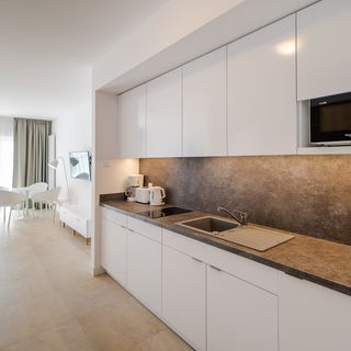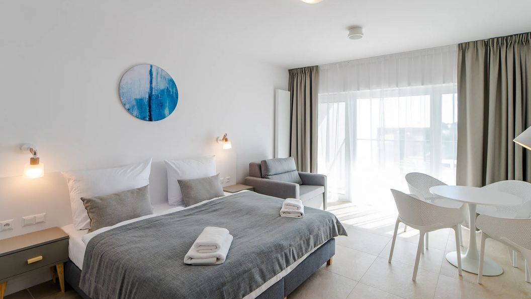 Apartament typu studio ma możliwość zakwaterowania 3 osób dorosłych. Przestrzeń apartamentu oferuje salon z aneksem kuchennym oraz łazienkę z prysznicem. Do mieszkania przynależy również przestronny balkon z widokiem na morze z 6. piętra budynku, co jest niewątpliwym atutem. Część dzienna wyposażona została w rozkładany fotel oraz podwójne łóżko, na których komfortowo można się wyspać oraz TV, co stanowi doskonałe miejsce również do rozrywki. Wyposażenie w niezbędne akcesoria kuchenne oraz łazienkowe gwarantują komfort pobytu. Dostępny stół pozwoli na spożywanie domowych posiłków przygotowanych na miejscu. Goście mogą skorzystać z powitalnego zestawu kosmetyków (mydło, szampon i żel pod prysznic), ręczników i szerokiej gamy artykułów gospodarstwa domowego, takich jak żelazko czy pralka. Obiekt posiada również bezpłatne łącze Wifi.