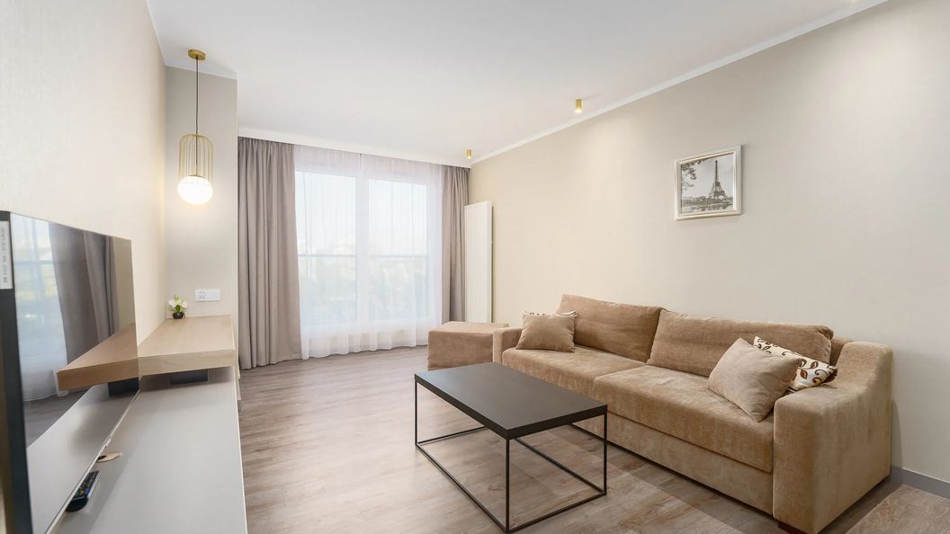 Rozkładana sofa, stolik kawowy, szafki, TV, wyjście na balkon, stół z 4 krzesłami