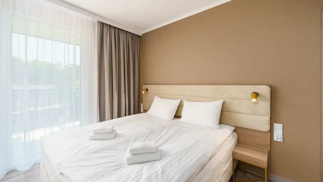 Apartament ma możliwość zakwaterowania 3 osób dorosłych. Przestrzeń apartamentu oferuje salon z aneksem kuchennym oraz łazienkę z prysznicem. Apartament wyróżnia się ciepłym wystrojem oraz funkcjonalnością. Część główna wyposażona została w wygodne podwójne oraz pojedyncze łóżko i TV — stanowi to doskonałe miejsce odpoczynku i relaksu. Dodatkowo w pełni wyposażony aneks kuchenny umożliwia przyrządzenie ulubionych posiłków. Mieszkanie posiada także balkon z meblami ogrodowymi. Przyjemny design oraz kompleksowe wyposażenie w niezbędne akcesoria kuchenne, oraz łazienkowe gwarantują komfort pobytu. Na dobry początek pobytu zapewniamy gościom bezpłatny zestaw kosmetyków, ręczniki oraz pościel.