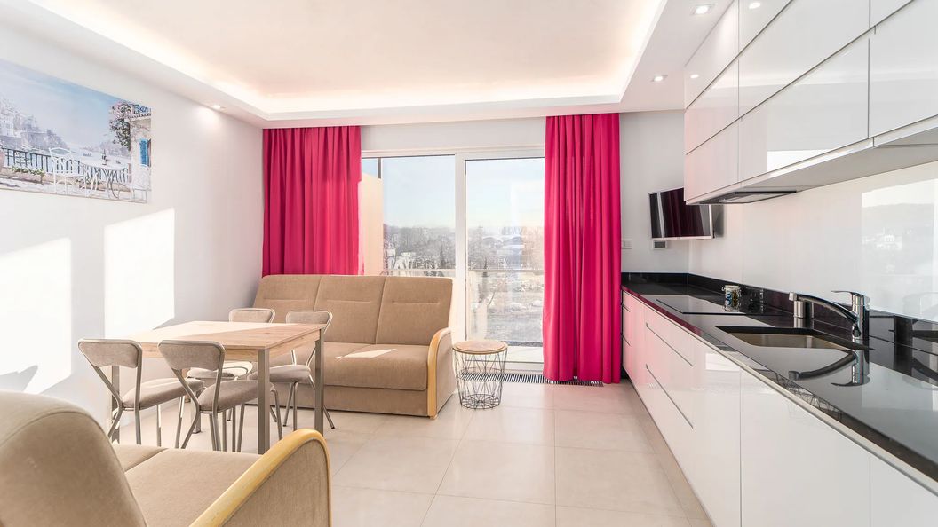 Przestrzeń apartamentu została zaprojektowana dla maksymalnie 4 osób. Do dyspozycji gości jest część dzienna z dwiema rozkładanymi sofami, stolikiem kawowym oraz telewizorem Smart TV. Z pokoju można wyjść na prywatny balkon z meblami ogrodowymi, stanowiący dodatkowe miejsce do odpoczynku na świeżym powietrzu.