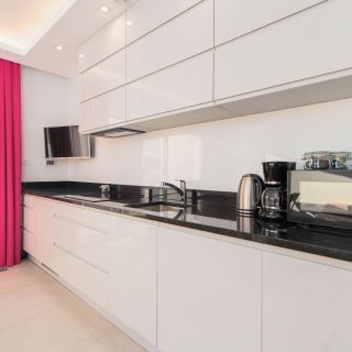 Integralną częścią studia jest w pełni wyposażony aneks kuchenny. Znajdują się w nim niezbędne sprzęty do samodzielnego przygotowywania posiłków, w tym płyta indukcyjna, lodówka, a także zmywarka, kuchenka mikrofalowa i przelewowy ekspres do kawy. Komfort użytkowania podnosi stół z krzesłami, przy którym można zjeść wspólny posiłek.