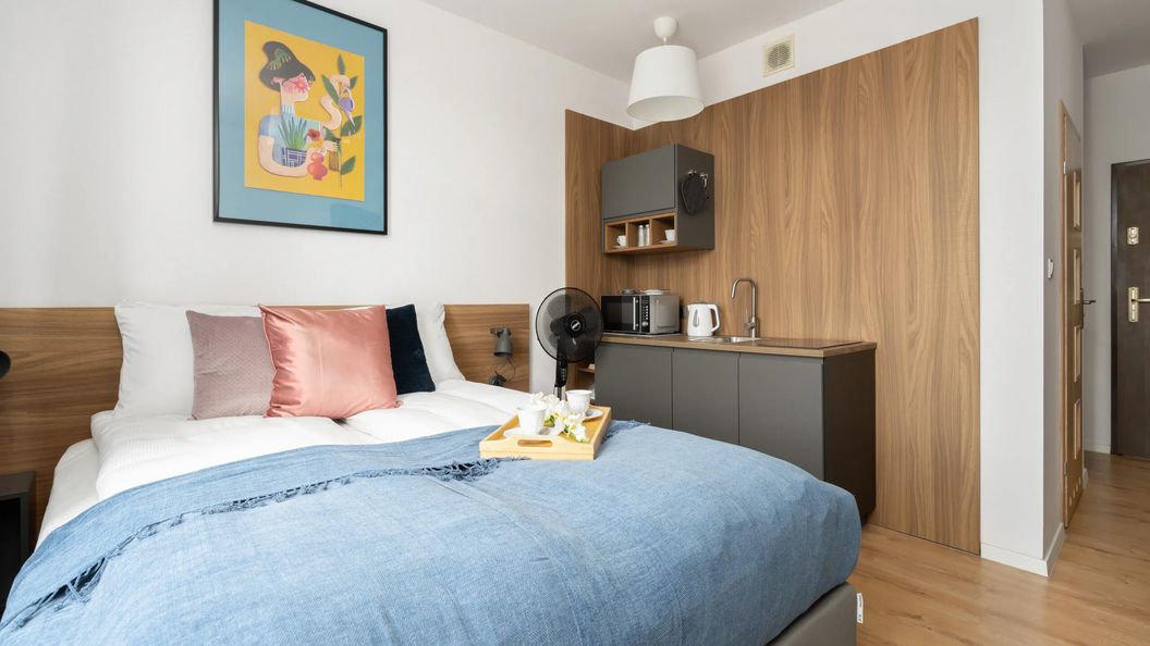 Apartament typu Studio o powierzchni mieszkalnej 21 m² ma możliwość zakwaterowania 2 osób. Jest to idealne rozwiązanie dla par zwiedzających Poznań lub na wyjazd biznesowy! Mieszkanie składa się z części wypoczynkowej, aneksu kuchennego oraz łazienki z prysznicem i toaletą. Studio jest bardzo przytulne. Nowoczesna przestrzeń ma niepowtarzalny urok tworzony przez jasny wystrój i swobodnie eleganckie meble. Komfort apartamentu dopełnia szeroka gama udogodnień, które sprawiają, że goście czują się tu jak w domu. Na dobry początek przyjemnego wypoczynku zapewniamy gościom bezpłatne kosmetyki (mydło, szampon i żel pod prysznic), ręczniki oraz pościel. Goście mogą skorzystać z szybkiego Wi-Fi i telewizora z płaskim ekranem. Zapraszamy również gości podróżujących ze zwierzętami, ponieważ jest to apartament przyjazny pupilom.