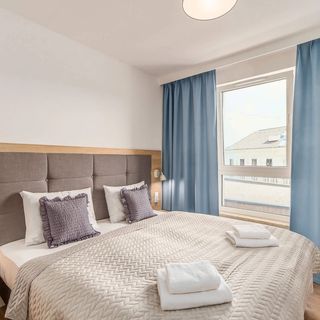 Oferta dotyczy apartamentu przeznaczonego dla 4 osób. Przestrzeń składa się z salonu z rozkładaną sofą, oddzielnej sypialni z łóżkiem małżeńskim oraz łazienki z prysznicem. Do dyspozycji gości jest również umeblowany balkon, stanowiący dodatkowe miejsce do odpoczynku. Wnętrze utrzymane jest w nowoczesnym, stylowym charakterze.