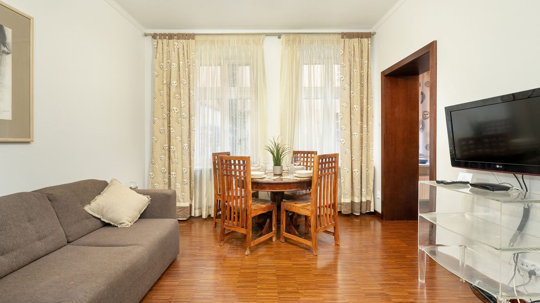 To doskonale zlokalizowane studio oferuje miejsce noclegowe dla 3 osób, dzięki czemu jest świetnym wyborem dla pary, jak i na wypad z przyjaciółmi. W skład powierzchni mieszkalnej wchodzi przestronny salon z dużą sofą narożnikową oraz wyznaczoną częścią sypialną z podwójnym łóżkiem, oddzielna kuchnia oraz stylowa łazienka z wanną i prysznicem. Gustowny wystrój z użyciem ciepłych barw, dodatków z naturalnego drewna oraz stylowych elementów dekoracyjnych sprawia, że w mieszkaniu panuje przyjemny i domowy klimat. Doskonale wyposażona kuchnia zapewnia dostęp do szerokiej gamy urządzeń - takich jak kuchenka mikrofalowa, płyta indukcyjna i czajnik - umożliwiających wygodne przygotowanie posiłków. W dodatku, apartament wypełniony jest naturalnym światłem dziennym, dzięki czemu mieszkanie jest jasne i przyjemne. Funkcjonalny układ pomieszczeń oraz kompleksowe wyposażenie w niezbędne akcesoria (pralka, suszarka do włosów) gwarantują najwyższy komfort pobytu. Multimedia obejmują bezpłatne łącze Wi-Fi oraz telewizor z płaskim ekranem. Dla ułatwienia rozpoczęcia każdego przyjazdu zapewniony jest bezpłatny zestaw kosmetyków (mydło, szampon i żel pod prysznic), ręczniki oraz pościel.