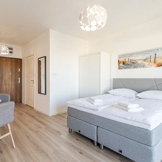 Zaaranżowany w wysokim standardzie apartament typu studio to miejsce, w którym pobyt jest prawdziwą przyjemnością. Ten wyjątkowy apartament może być wygodnym noclegiem dla 3 osób – idealny na pobyt z rodziną czy przyjaciółmi. Układ pomieszczeń składa się ze studia z aneksem kuchennym, balkonu oraz łazienki z prysznicem. Przestrzeń jest bardzo funkcjonalna, co pozwala na elastyczną i wygodną konfigurację układu spania: goście mogą wybrać pomiędzy podwójną sofą lub rozkładanym pojedynczym fotelem. Studio wyposażono także w stół z krzesłami do wspólnego celebrowania posiłków. Do apartamentu przynależy balkon z meblami ogrodowymi, gdzie można delektować się poranną kawą na świeżym powietrzu lub odpoczywać po dniu pełnym wrażeń. Wysublimowana aranżacja apartamentu oraz wysokiej jakości wyposażenie gwarantują pobyt na najwyższym poziomie. Dopełnieniem wyjątkowej aury mieszkania jest atrakcyjna kolorystyka wnętrza nawiązująca do nadmorskiego otoczenia apartamentu z zastosowaniem stylowych elementów dekoracyjnych. Studio wyposażone jest w nowoczesne udogodnienia, takie jak bezpłatny dostęp do sieci Wi-Fi oraz Smart TV z płaskim ekranem – idealny na seanse filmowe. Pełne wyposażenie łazienkowe i kuchenne - takie jak suszarka do włosów, płyta indukcyjna czy ekspres do kawy (przelewowy) - zwiększa niezależność naszych gości. Na dobry początek każdego pobytu zapewniony jest bezpłatny zestaw kosmetyków, ręczniki i pościel. Lokalizacja apartamentu z pewnością pozwoli poczuć klimat Wybrzeża wśród najważniejszych atrakcji. Dla gości podróżujących autem, przygotowano miejsce postojowe na parkingu zewnętrznym. Dzięki tym zaletom apartament jest idealnym wyborem na beztroski pobyt nad morzem.