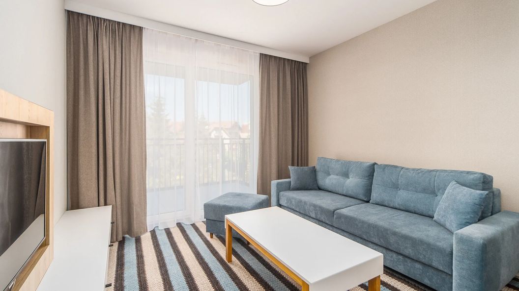 Rozkładana sofa, stolik kawowy, TV, stół z krzesłami, wyjście na balkon
