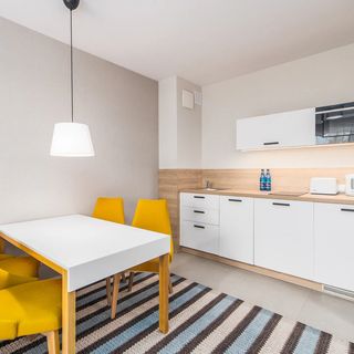 Lodówka z zamrażarką, ekspres do kawy (przelewowy), zmywarka, kuchenka mikrofalowa, zestaw sztućców i naczyń, płyta indukcyjna, przybory kuchenne, czajnik elektryczny, szklanki, kubki, garnki, patelnia, kieliszki do wina