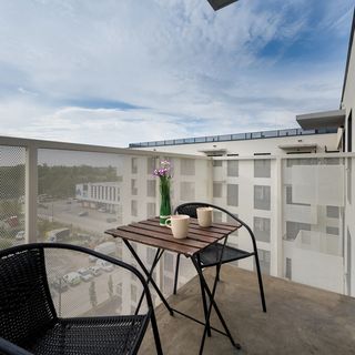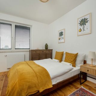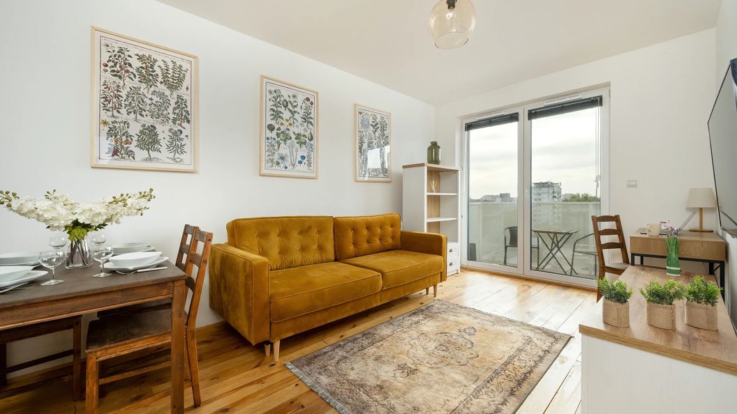 Gustowny i cichy apartament znajdujący się na ostatnim piętrze budynku przeznaczony jest dla 4 osób - to idealny wybór na rodzinny wyjazd lub dla pary przyjaciół. Funkcjonalnie zaaranżowana powierzchnia prawie 37 m² składa się z salonu z aneksem kuchennym i wyjściem na balkon, sypialni oraz łazienki z prysznicem i toaletą. Część dzienna oferująca sofę oraz telewizor z płaskim ekranem, jak również sypialnia z wygodnym dwuosobowym łóżkiem, stanowią doskonałe miejsce odpoczynku oraz relaksu. Dodatkowo, prywatny balkon z widokiem na okoliczną zieleń i w dalszej perspektywie na centrum miasta, jest idealny do delektowania się poranną filiżanką kawy. Goście pracujący zdalnie znajdą w apartamencie także wygodne miejsce do pracy z laptopem, a dzięki szybkiemu połączeniu internetowemu, nie muszą martwić się o wypełnianie swoich codziennych obowiązków. Multimedia w apartamencie obejmują bezpłatny Internet Wifi oraz telewizor z płaskim ekranem (dostęp do platform: YouTube, Netflix). Przestrzeń mieszkania jest funkcjonalnie urządzona i uzupełniona szerokim wachlarzem udogodnień, w tym pełnym wyposażeniem kuchennym i łazienkowym. Na dobry początek każdego pobytu zapewniony jest bezpłatny zestaw kosmetyków, ręczniki i pościel. Na wyposażeniu mieszkania goście znajdą również pralkę, co z pewnością docenią rodziny z małymi dziećmi czy osoby planujące dłuższy pobyt. Apartament jest dobrze doświetlony, dzięki południowej ekspozycji. Stanowi doskonały wybór dla podróżnych, którzy nie uznają kompromisów w kwestii stylu i komfortu. Jasny, nieco botaniczny wystrój pomieszczeń z dodatkiem ciepłych kolorów i litą drewnianą podłogą, nadaje mieszkaniu niezwykle przytulny klimat. Całość wnętrza przykuwa uwagę swoim harmonijnym, nowoczesnym stylem.