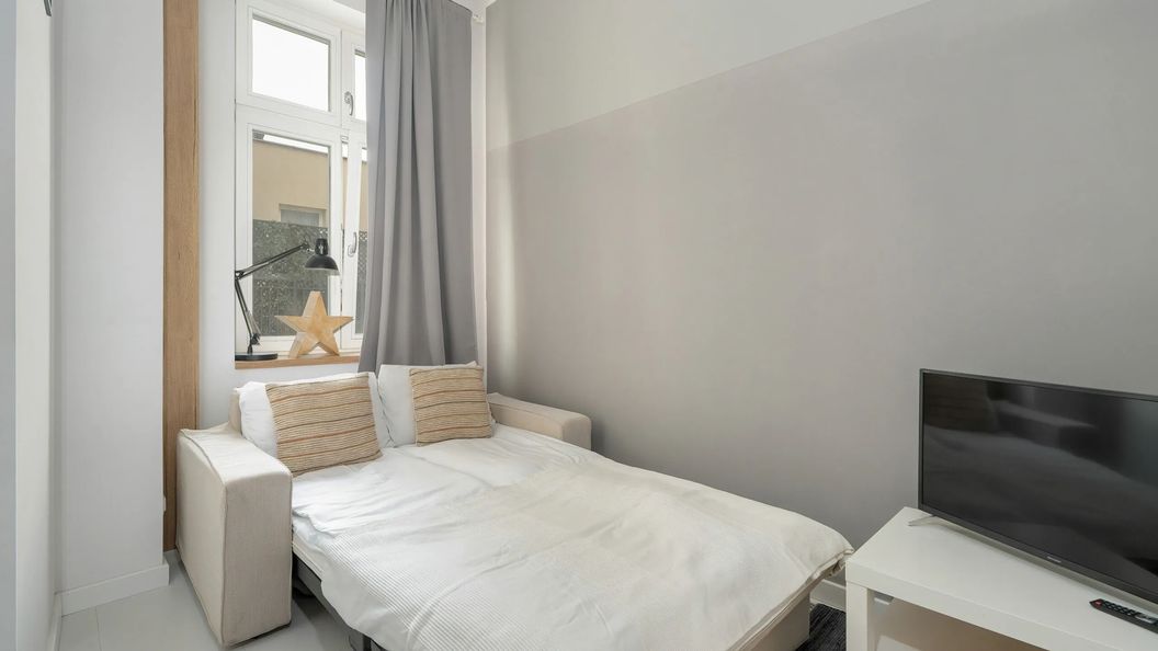 To przytulne studio może pomieścić 2 osoby i stanowi idealny wybór dla par, wyjazd w pojedynkę lub na podróż służbową! Przestrzeń mieszkalna 17 m² oferuje pokój dzienny z wygodną podwójną sofą, aneks kuchenny oraz łazienkę z prysznicem. Multimedia w mieszkaniu obejmują telewizor Smart TV, a także bezpłatną sieć Wifi. Szeroka gama artykułów gospodarstwa domowego oraz kompleksowe wyposażenie w niezbędne akcesoria kuchenne i łazienkowe gwarantują komfort pobytu. Na dobry początek każdej wizyty zapewniony jest bezpłatny zestaw kosmetyków, ręczniki i pościel. W apartamencie znajduje się pralka, przydatna szczególnie w trakcie dłuższych pobytów. Niewielka przestrzeń obiektu jest funkcjonalnie i komfortowo zaprojektowana, wychodząc naprzeciw wszelkim potrzebom gości.