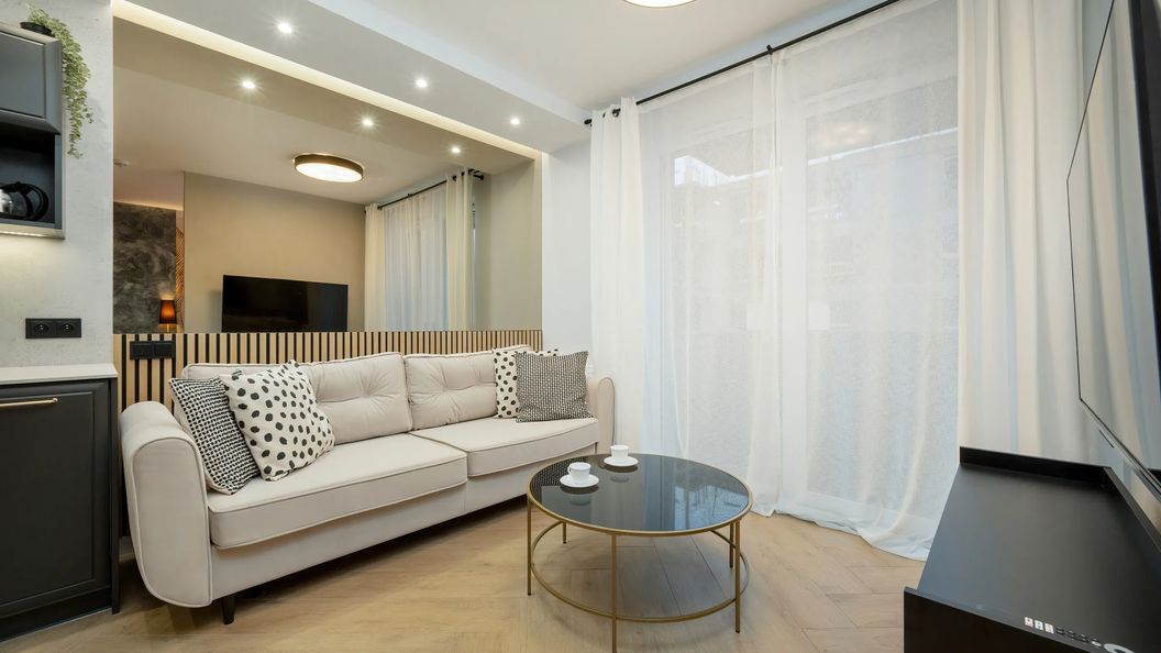 Ten elegancki apartament jest przeznaczony dla czterech osób i ma jedną sypialnię. Znajduje się on na czwartym piętrze. Goście mogą skorzystać tutaj z balkonu, aby oglądać miasto z wysokości, czy też wypić poranną kawę. W wystroju dominuje czerń i beż – w niektórych miejscach pojawiają się również delikatne, szare akcenty. Jest to gustownie urządzony apartament, którego aranżacja to nowoczesna i intrygująca kompozycja starannie dobranych mebli i dekoracji. W części wypoczynkowej stoi rozkładana kanapa dwuosobowa, a także stolik – wieczorami można tu wygodnie usiąść, aby oglądać telewizję i rozmawiać. W salonie znajduje się również aneks kuchenny, stół jadalniany oraz krzesła. Łazienka została wyposażona w prysznic oraz pralkę. Odwiedzający mogą wygodnie przechowywać swoje rzeczy w pojemnych szafach, dzięki czemu schowanie dużej ilości ubrań nie jest problemem. Zwierzęta są akceptowane, co pozwala miłośnikom czworonogów na zabranie w podróż swojego pupila. W sypialni zlokalizowane jest dwuosobowe łóżko i niewielki stolik idealny do przechowywania podręcznych drobiazgów. Do dyspozycji gości jest miejsce postojowe usytuowane w hali garażowej. Znajdujący się w przestrzeni kuchennej piekarnik jest wyposażony w funkcję kuchenki mikrofalowej.