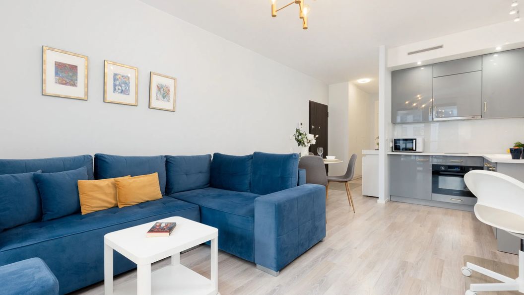 Wysoce funkcjonalna przestrzeń składa się z salonu z aneksem kuchennym, sypialni oraz łazienki z prysznicem. Do mieszkania przynależy również balkon z meblami ogrodowymi, na którym to można wypić kawę bądź też herbatę na dobry początek dnia. Staranne wykończenie wnętrza, podkreślają wysoki standard apartamentu. Dodatkowym atutem jest klimatyzacja dostępna w salonie, dbająca o odpowiednią temperaturę otoczenia. Wyjątkowa aranżacja mieszkania i pełne wyposażenie w niezbędne akcesoria kuchenne oraz łazienkowe zapewniają relaksujący i bezproblemowy pobyt. W salonie znajduje się biurko, co w połączeniu z internetem WiFi pozwala pracować zdalnie. Do apartamentu przynależy prywatne miejsce parkingowe w garażu podziemnym.