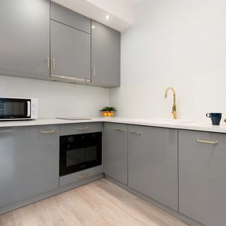 Zmywarka, czajnik elektryczny, lodówka z zamrażalką, płyta indukcyjna, piekarnik, kuchenka mikrofalowa, szklanki, zestaw garnków, sztućców, patelnia