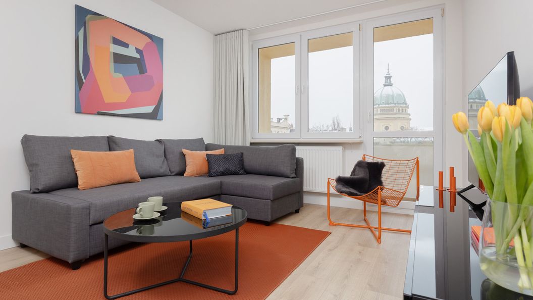Ten elegancki apartament położony jest w samym centrum Warszawy przy ulicy Nowogrodzkiej 56, zaledwie 400 m od Pałacu Kultury i Nauki i 450 m od stacji metra Centrum! Okolica ma międzynarodowy charakter dzięki licznym centrom administracyjnym i biznesowym, połączonym z wielkomiejskim klimatem licznych, klimatycznych kawiarni i restauracji. Kultowe centrum biznesowo-rozrywkowe Złote Tarasy znajduje się w odległości 5 minut spacerem. Z tej lokalizacji łatwo jest również odkryć bogatą scenę kulturalną Warszawy - w okolicy znajdują się liczne teatry. Dodatkowo, okolica oferuje niezliczone sklepy spożywcze, bary, puby i restauracje, więc wszystko czego potrzebujesz jest na wyciągnięcie ręki! Lokalizacja jest również świetną bazą wypadową do zwiedzania innych dzielnic Warszawy - sieć komunikacji miejskiej jest bardzo dobrze rozwinięta, dzięki czemu szybko i wygodnie dotrzesz do innych części miasta.
