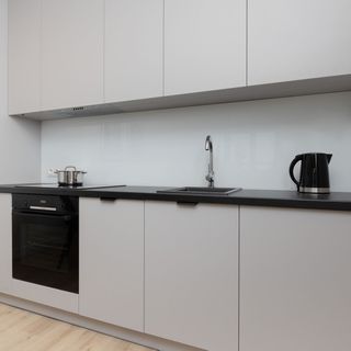 Stół z krzesłami, czajnik, lodówka, zamrażarka, zmywarka, płyta indukcyjna, piekarnik, szklanki, zestaw garnków, sztućce, patelnia