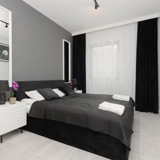 Ten klimatyzowany apartament ma możliwość zakwaterowania 4 osób - jest to idealny wybór na rodzinny wyjazd lub dla grupki przyjaciół. Wysoce funkcjonalna przestrzeń o powierzchni 46 m² składa się z salonu z aneksem kuchennym, sypialni oraz łazienki z prysznicem i toaletą. Do apartamentu przynależy balkon z meblami ogrodowymi, idealne miejsce na łyk porannej kawy czy odpoczynek po dniu pełnym wrażeń. Część dzienna wyposażona w wygodną sofę, jak i sypialnia z podwójnym łóżkiem, stanowią doskonałe miejsce odpoczynku oraz relaksu. Do dyspozycji gości jest telewizor z płaskim ekranem i funkcją Smart TV – świetny na wieczorne seanse filmowe. Multimedia obejmują również bezpłatny bezprzewodowy dostęp do Internetu. Szeroki wachlarz udogodnień oraz kompleksowe wyposażenie apartamentu w niezbędne akcesoria i sprzęty kuchenne, jak i łazienkowe gwarantuje komfort pobytu. Dla ułatwienia rozpoczęcia każdej wizyty zapewniony jest bezpłatny zestaw kosmetyków (mydło, szampon i żel pod prysznic), ręczniki oraz pościel. Wnętrze apartamentu emanuje aurą nowoczesności i prostego stylu, utrzymane w klasycznej biało-czarnej kolorystyce. Wyróżnia się estetyką, a wysokiej jakości wyposażenie eksponuje wysoki standard mieszkania.