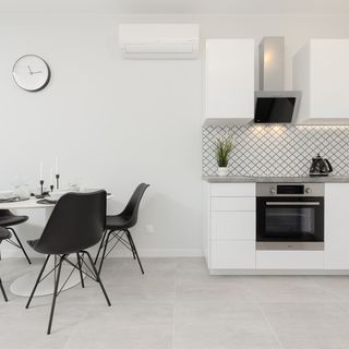 Lodówka z zamrażarką, piekarnik, płyta indukcyjna, zmywarka, czajnik elektryczny, ekspres do kawy, naczynia kuchenne i stołowe, stół z krzesłami