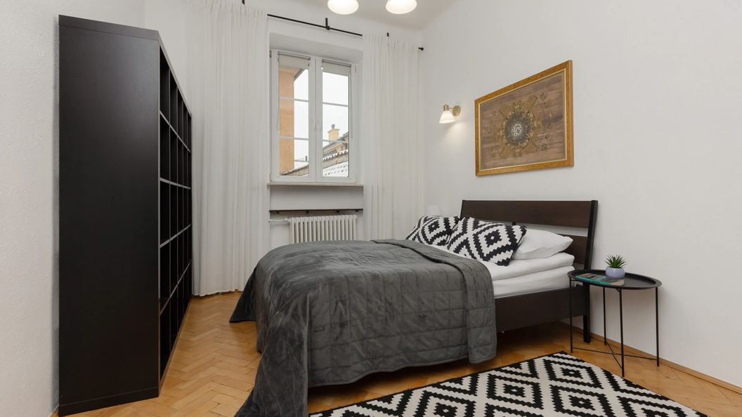 Apartament mieści się na pierwszym piętrze w budynku bez dostępu do windy. Pomieścić może 4 osoby. Stanowi idealną opcję dla rodziny lub grupy przyjaciół. Miejsca do spania znajdują się w salonie - sofa narożnikowa, w sypialni - podwójne łóżko małżeńskie. Przygotować pyszny posiłek można w oddzielnej kuchni, używając do tego dostępnej kuchenki gazowej, a także piekarnika lub kuchenki mikrofalowej. Nie należy się również martwić zmywaniem naczyń, ponieważ w apartamencie znajduje się zmywarka. Przyrządzone potrawy zjeść można w kuchni przy czteroosobowym stole albo przy barku do którego dołączone są stołki barowe. W salonie znajdują się dwie sofy przeznaczone do siedzenia, a także telewizor z płaskim ekranem. Łazienka posiada dostęp do prysznica i pralki, a także zestaw bezpłatnych powitalnych kosmetyków. Apartament przystosowany jest dla osób pracujących zdalnie, znajduje się w nim biurko wraz z krzesłem oraz szybkie połączenie Wifi. Zwierzęta są akceptowane. Do apartamentu nie jest przypisane żadne miejsce parkingowe.