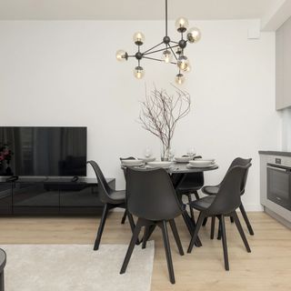 Sofa rozkładana, telewizor z funkcją SmartTV+, stół, trzy krzesła, stolik