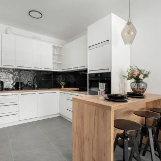 Część dzienna została połączona z w pełni wyposażonym aneksem kuchennym, który umożliwia samodzielne przygotowywanie posiłków. Goście znajdą w nim płytę indukcyjną, piekarnik, zmywarkę, lodówkę oraz kuchenkę mikrofalową. Dostępny jest również ekspres do kawy, czajnik elektryczny i komplet niezbędnych akcesoriów kuchennych.
