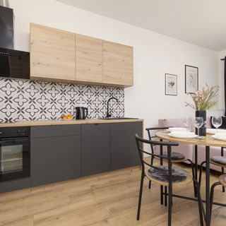 Kuchenka indukcyjna, lodówka, czajnik elektryczny, naczynia, sztućce, szklanki, kubki, patelnia, zestaw garnków, kuchenka mikrofalowa, piekarnik, zmywarka