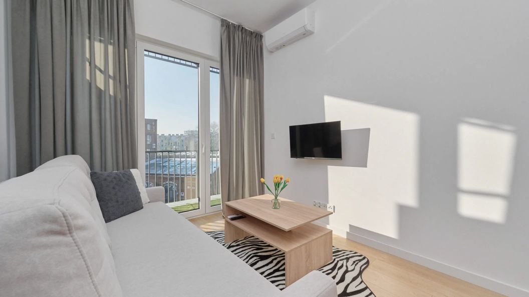 Rozkładana sofa, telewizor, stolik kawowy, stół, krzesła, , komplet pościeli, wyjście na balkon