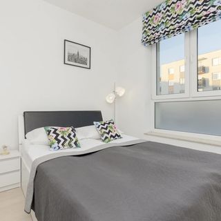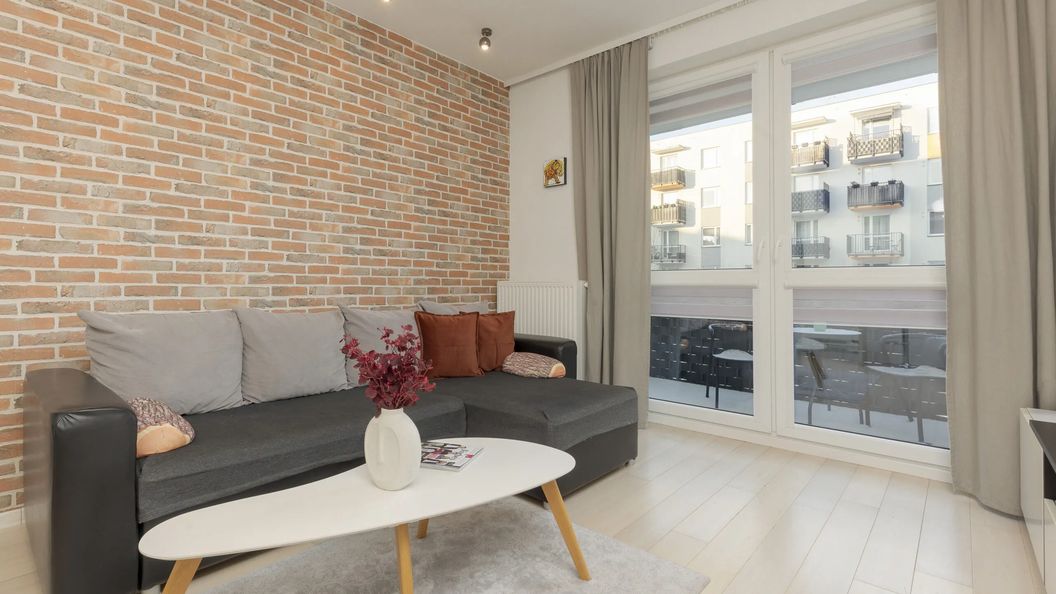Ten elegancki apartament ma do zaoferowania odwiedzającym estetyczny i stylowy wystrój utrzymany w delikatnej kolorystyce. Nowoczesne wnętrze sprawia, że jest to doskonałe miejsce do wypoczynku dla par, a także rodziców planujących wycieczkę rekreacyjną ze swoimi dziećmi. Lokal jest przeznaczony dla czterech osób i znajduje się na pierwszym piętrze wyposażonego w windę budynku. W salonie stoi rozkładany narożnik, stolik i telewizor. Do dyspozycji gości jest tu również przestrzeń jadalniana dla dwóch osób. Funkcjonalnie wyposażony aneks kuchenny pozwala na sprawne i wygodne przyrządzanie posiłków – dostępny jest tutaj piekarnik z funkcją kuchenki mikrofalowej, lodówka z zamrażarką oraz czajnik. W sypialni dominuje biało-szara kolorystyka. W pomieszczeniu umieszczono komfortowe łóżko dwuosobowe i pojemną szafę idealną do przechowywania przywiezionych ubrań czy też innych przedmiotów. W łazience zlokalizowany jest prysznic i pralka, a także suszarka do włosów i zestaw kosmetyków. Z salonu można wyjść na umeblowany balkon – niewielki stolik oraz dwa krzesła umożliwiają wypicie porannej kawy na powietrzu w przyjemnej atmosferze.