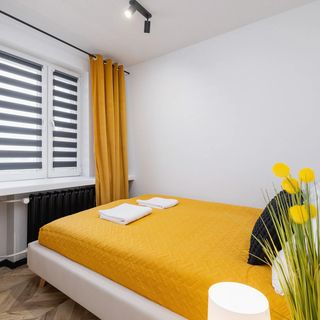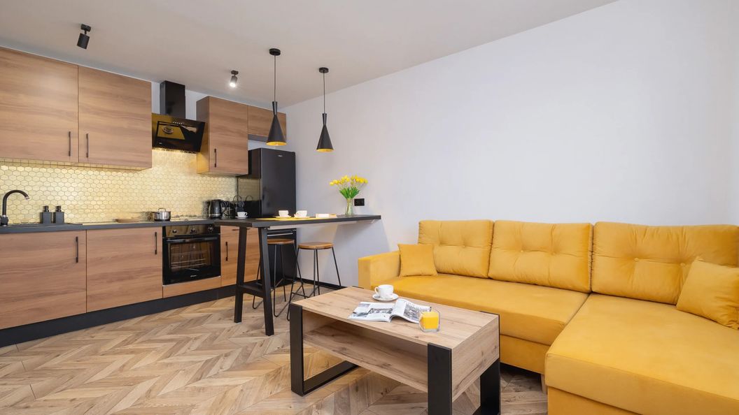 Stylowy apartament, urządzony w z dbałością o najmniejsze szczegóły posiada powierzchnię 32 m². Z przyjemnością ugości on 4 osoby, a jego przestrzeń składa się z salonu, osobnej sypialni, aneksu kuchennego oraz łazienki z wanną. Wystrój apartamentu to idealnie dobrane złote dodatki, jasne ściany i drewniane elementy wyposażenia. Tworzy to niezwykle przytulną i ciepłą atmosferę, która sprawi, że nasi Goście będą mogli poczuć się wyjątkowo. Apartament będzie doskonałym miejscem noclegowym w centrum miasta, a pobyt w nim z pewnością będzie udany. Salon wyposażony jest w wygodną rozkładaną sofę narożną oraz stolik kawowy. Znajduje się w nim także stół z krzesłami i telewizor z funkcją SmartTV, dzięki któremu nasi Goście będą mogli oglądać swoje ulubione filmy i seriale. Aneks kuchenny będzie idealnym miejscem do wspólnego przygotowywania posiłków. Posiada on bowiem wszystkie niezbędne kuchenne przybory oraz udogodnienia takie jak: zmywarka, piekarnik, lodówka i ekspres do kawy. Osobna sypialnia gwarantuje prywatność oraz komfort podczas pobytu. Duże łóżko małżeńskie pozwoli na odpoczynek po intensywnym dniu, a szafa w sypialni posiada dużą ilość przestrzeni do przechowywania. Elegancka łazienka posiada wannę wraz z prysznicem. Dostępna jest także pralka, ręczniki, zestaw kosmetyków oraz suszarka do włosów. Dla każdego Gościa zapewniamy oczywiście zestaw świeżej pościel. Wyposażenie multimedialne apartamentu stanowi telewizor oraz dostęp do Internetu w postaci sieci WIFI.