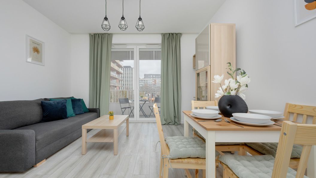 Ten w pełni wyposażony apartament z balkonem ma możliwość zakwaterowania 4 osób - jest to idealny wybór na rodzinny wyjazd lub dla pary przyjaciół. Wysoce funkcjonalna przestrzeń składa się z salonu z aneksem kuchennym, sypialni oraz łazienki z wanną i toaletą. Część dzienna wyposażona w wygodną sofę, jak i sypialnia z podwójnym łóżkiem, stanowią doskonałe miejsce odpoczynku oraz relaksu. Do dyspozycji gości jest także balkon z meblami ogrodowymi, gdzie można delektować się łykiem porannej kawy, czy odpocząć po całym dniu zwiedzania. Obiekt zapewnia biurko z krzesłem w sypialni, dzięki czemu goście pracujący zdalnie będą mogli w komfortowy sposób zadbać o obowiązki służbowe. Kompleksowe wyposażenie w niezbędny sprzęt kuchenny, łazienkowy oraz bezpłatne łącze Wifi i telewizor z płaskim ekranem zapewniają komfortowy pobyt. Dla ułatwienia rozpoczęcia każdej wizyty zapewniony jest bezpłatny zestaw kosmetyków (mydło, szampon i żel pod prysznic), ręczniki oraz pościel. Obiekt wyróżnia się starannym wykończeniem, a wysokiej jakości wyposażenie eksponuje wysoki standard mieszkania. Stylowo zaaranżowana, jasna i nowoczesna przestrzeń apartamentu utrzymana jest w bieli i szarości. Istnieje możliwość, aby zabrać na wyjazd swojego ulubionego pupila, gdyż obiekt akceptuje zwierzęta.