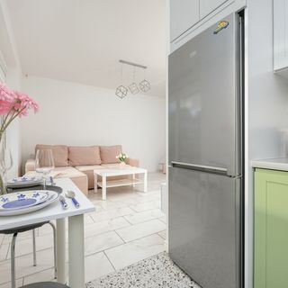 Zmywarka, czajnik, zestaw naczyń kuchennych i stołowych, lodówka, ekspres do kawy, stół z krzesłami
