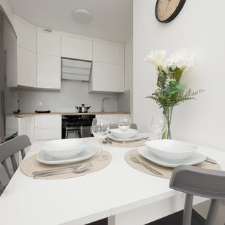 Czajnik elektryczny, płyta indukcyjna, mikrofalówka, lodówka, naczynia kuchenne i zastawa stołowa
