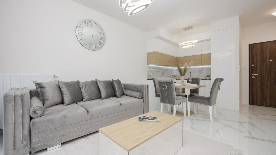 Ten luksusowy apartament został urządzony z dbałością o funkcjonalność i komfort użytkowania przestrzeni. W aranżacji wykorzystano odcienie szarości, dzięki czemu wnętrze prezentuje się nowocześnie, elegancko i stylowo. Lokal jest przeznaczony dla czterech osób i posiada jedną sypialnię. Do dyspozycji zmotoryzowanych odwiedzających jest miejsce postojowe w hali garażowej. W salonie znajduje się rozkładana sofa dwuosobowa, a także stolik, który można wykorzystać do pracy zdalnej lub też serwowania przekąsek wieczorami, gdy ogląda się telewizję kablową. W pomieszczeniu znajduje się też jadalniany stół z krzesłami. Apartament ma do zaoferowania również umeblowany balkon – można wypić na nim poranną kawę lub też zrelaksować się w przerwie od aktywności. Aneks kuchenny, w którym znajduje się piekarnik i kuchenka indukcyjna, umożliwia proste przygotowywanie posiłków. W sypialni stoi wygodne łóżko dwuosobowe i pojemna szafa z lustrem, w której można schować przywiezione rzeczy. Łazienka została wyposażona w bezprogowy prysznic, pralkę i suszarkę do włosów. Apartament ten mieści się na pierwszym piętrze nieruchomości.