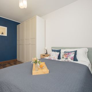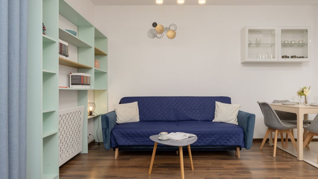 Ten przestronny i przytulnie urządzony apartament ma jedną sypialnię i jest przeznaczony dla czterech osób. Lokal jest usytuowany na trzecim piętrze budynku. W wystroju dominują stonowane odcienie beżu i szarości – o urozmaicenie kompozycji wizualnej dbają ciemnoniebieskie akcenty, dzięki którym wnętrze prezentuje się nowocześnie i elegancko. Efektywne zagospodarowanie dostępnego miejsca sprawia, że apartament jest funkcjonalny i wygodny w użytkowaniu. W sypialni goście mają do dyspozycji wygodne łóżko dwuosobowe oraz pojemną szafę, w której można przechowywać przywiezione przedmioty. W salonie znajduje się wyjście na umeblowany balkon, na którym można wypić poranną kawę i zrelaksować się na powietrzu w przerwie od aktywności. Pomieszczenie zostało wyposażone również w szafki, jadalniany stół z krzesłami, rozkładaną sofę dwuosobową oraz stolik. Odwiedzający mogą łatwo przygotowywać przekąski i dania w kompleksowo urządzonym aneksie kuchennym – można znaleźć tutaj kuchenkę mikrofalową, piekarnik, a także płytę indukcyjną. W łazience umieszczono wannę, co sprawia, że goście mogą relaksować się wieczorami w łazience. Można tu przyjeżdżać ze swoimi zwierzętami, aby nie zostawiać ich w domu na czas planowanego wyjazdu.