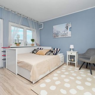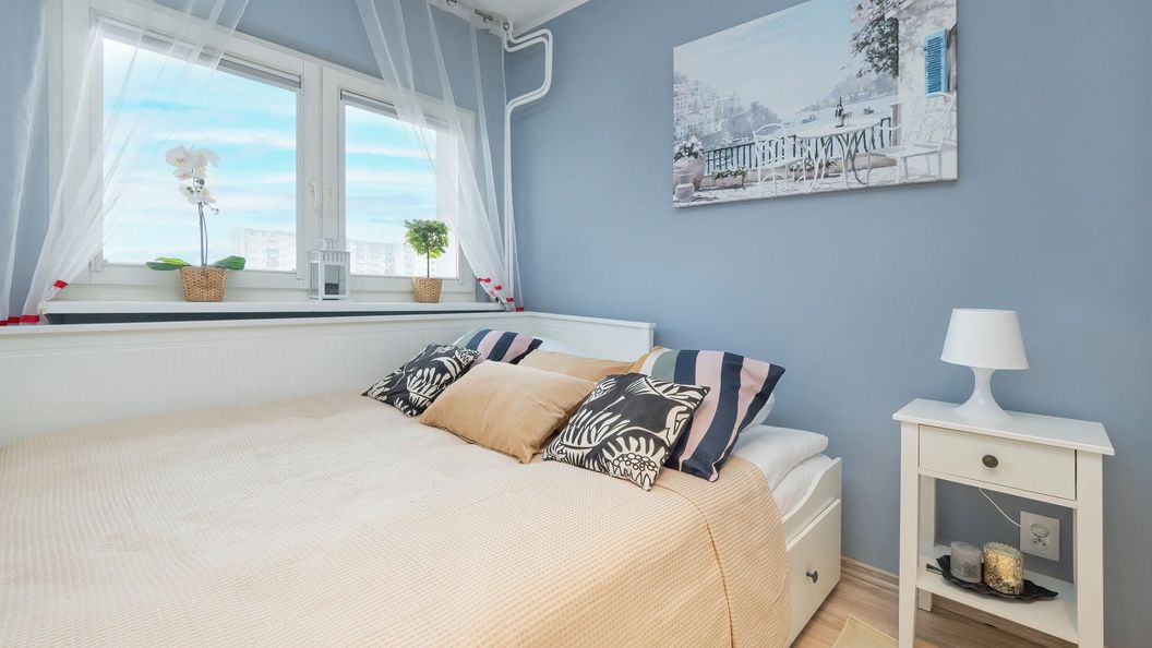 To efektywnie zagospodarowane studio jest przeznaczone dla dwóch osób i znajduje się na piątym piętrze wyposażonego w windę budynku. Jest to wspaniałe miejsce na romantyczny wyjazd dla par lub też biznesową podróż dla tych, którzy pracują zdalnie. W części mieszkalnej znajduje się rozkładana sofa dwuosobowa i fotel. O możliwość komfortowego przechowywania przywiezionych rzeczy dba pojemna szafa oraz dostępne w lokalu szafki. Apartament ten ma oddzielną kuchnię, w której dostępny jest stół z dwoma krzesłami, a także sprzęty takie jak między innymi kuchenka mikrofalowa i gazowa, dzięki którym można sprawnie i wygodnie przyrządzać przekąski oraz potrawy. W łazience do dyspozycji odwiedzających jest prysznic, pralka, zestaw kosmetyków i suszarka do włosów. Umieszczono tu też ręczniki. Apartament ma do zaoferowania również balkon z widokiem na miejski krajobraz i zieloną przestrzeń, na który można wyjść w przerwie od zaplanowanych aktywności, aby zrelaksować się na powietrzu. Goście mogą przyjeżdżać tutaj ze swoimi zwierzętami, aby nie zostawiać ich w domu na czas wyjazdu. W wystroju części mieszkalnej dominuje pastelowy odcień niebieskiego, a także stonowana i subtelna biel. Z kolei kuchnia została zaaranżowana z wykorzystaniem wyrazistej, żółtej barwy. Dzięki temu wnętrze jest urozmaicone. Apartament posiada Świadectwo Charakterystyki Energetycznej.