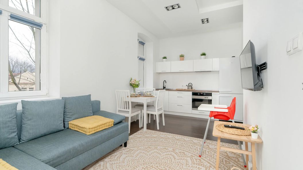 Przytulny oraz dobrze zagospodarowany apartament posiada 30 m² i składa się na salon z aneksem kuchennym, sypialnię oraz łazienkę z prysznicem. Dzięki takiej przestrzeni jest idealny dla maksymalnie 3 osób. Komfortowy pobyt zapewnia funkcjonalny, dobrze wyposażony aneks kuchenny, w którym znajduje się piekarnik, płyta indukcyjna czy lodówka. Przyrządzonymi posiłkami można cieszyć się przy wygodnym stole, a dla maluszków zagwarantowane jest krzesełko do karmienia. Salon posiada wygodną kanapę, na której można odpocząć po długim dniu pełnym wrażeń. Dodatkowo po rozłożeniu sofa pełni również funkcję spania dla jednej osoby. W pełni zagospodarowana sypialnia posiada łóżko Queensize. Wieczorną rozrywkę zapewniają multimedia, takie jak telewizor z płaskim ekranem w salonie, a także bezpłatny dostęp do sieci Wi-Fi. Dodatkowym atutem mieszkania jest pralka, która zwiększy komfort podczas dłuższych pobytów. Na dobry początek pobytu zapewniamy gościom bezpłatny zestaw kosmetyków, ręczniki oraz pościel. Ponadto właściciele czworonogów są u nas mile widziani.