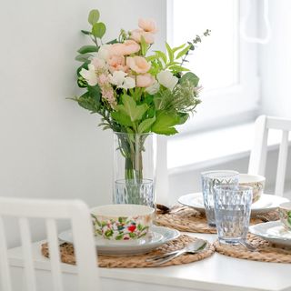 Sofa, telewizor, stół jadalniany z krzesłami, krzesełko do karmienia dzieci