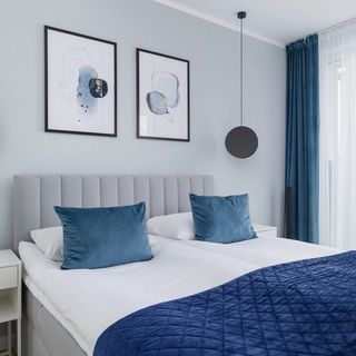 Łóżko małżeńskie, komplet pościeli, szafki nocne, biurko z krzesłem, szafa z lustrem